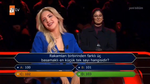 Ünlü oyuncu Kenan İmirzalıoğlu'nun sunumuyla ekranlara gelen Kim Milyoner Olmak İster' de üçüncü soruda elenen Sena Erol, verdiği cevapla gündem oldu. Yarışmacı Sena Erol'a "Rakamları birbirinden farklı üç basamaklı en küçük tek sayı hangisidir?" diye soruldu. Erol, şıklar arasında kararsız kaldı. Erol, bir süre düşündükten sonra C şıkkında karar kıldı. Soruya C şıkkını seçerek 102 cevabını veren Erol, yarışmadan elendi. Doğru şık açılmadan önce cevabını değiştirmek isteyen Erol'un, 'son kararım' dediği için verdiği cevap geçerli oldu. Genç yarışmacı 5 bin TL alarak yarışmaya veda etti.