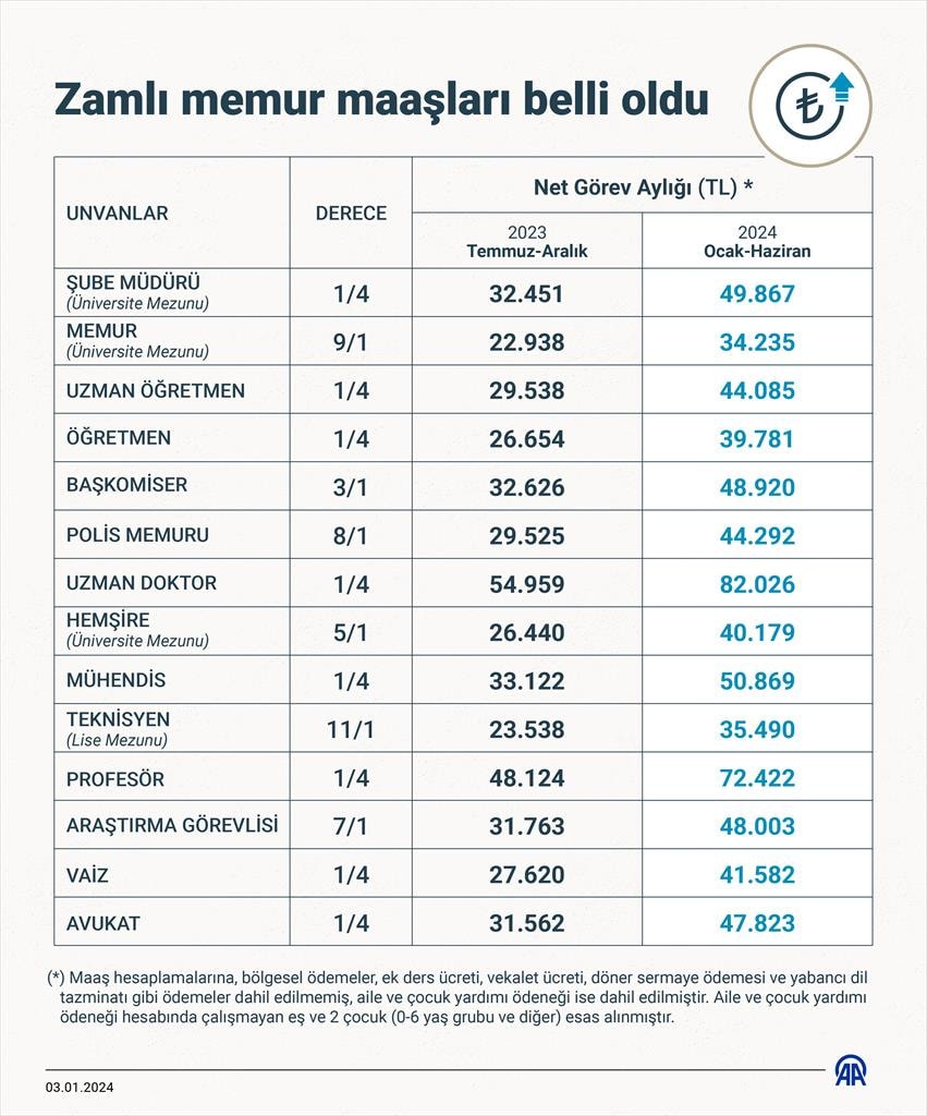 Memur ve memur emeklileri ocak ayında yüzde 15 de toplu sözleşme zammı alacak. Böylece ocak ayındaki zam oranı yüzde 49,25 olacak.
